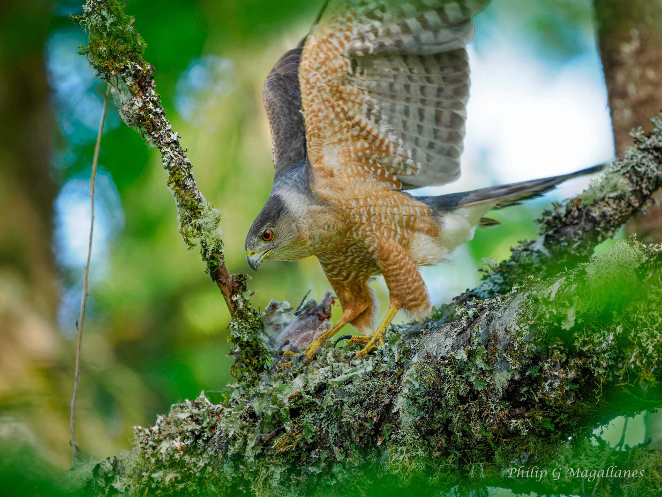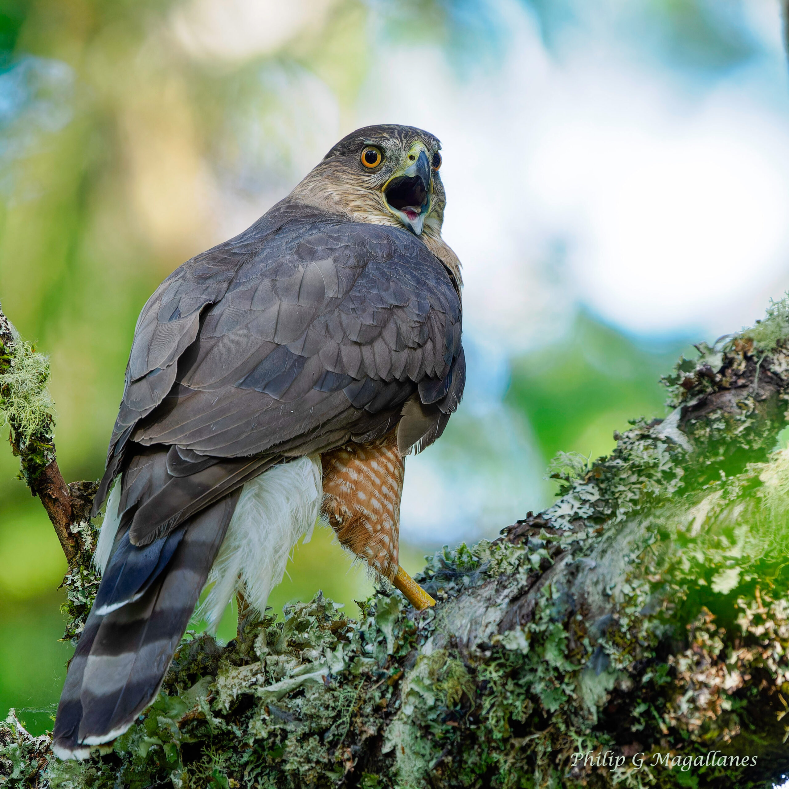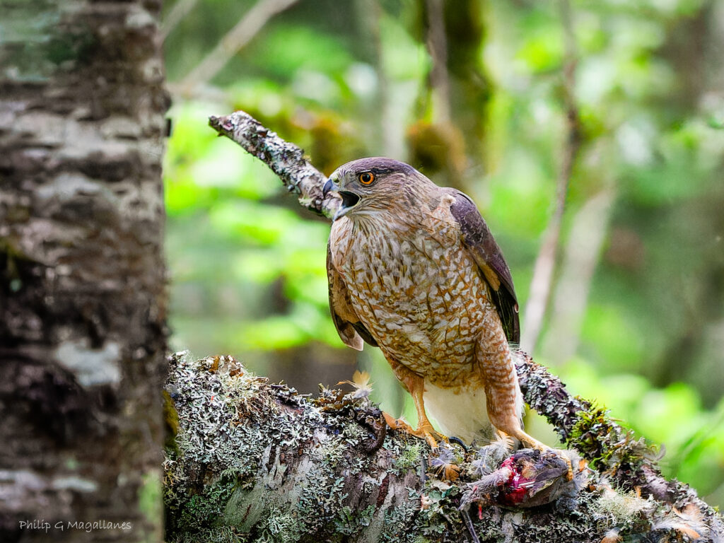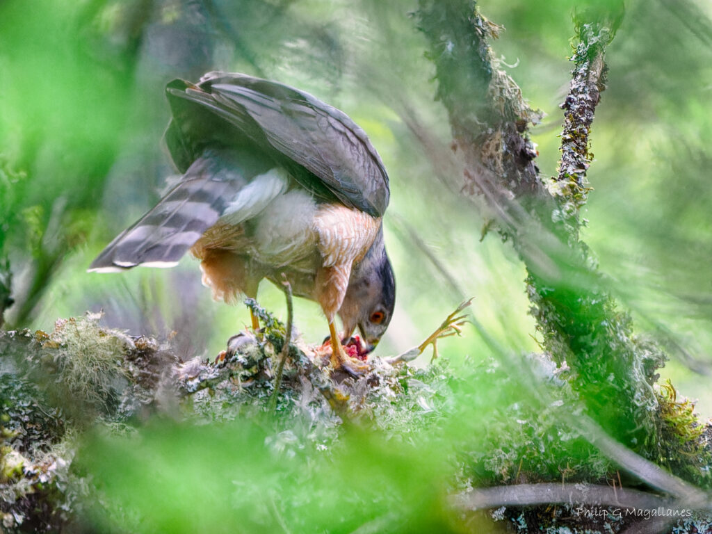 After the siblings had all fledged, we noticed that the nest seemed to disassemble. After a few days we could no longer find any evidence of the nest. Our expert, Ed told us that it was unusual, but that it did happen. We do not know why it happened. Up to this point, the parents would use the nest as a food drop off point. But after the nest disappeared, the dad began using the Plucking Post as the drop off point. This made it very easy for us to observe and photograph the hawk family. They were not bothered by our presence on the trail; however, the dad was bothered by horses.