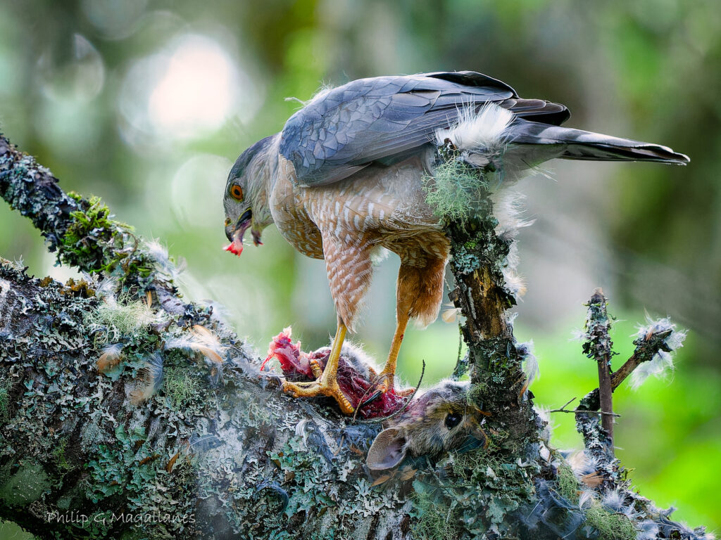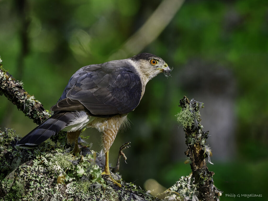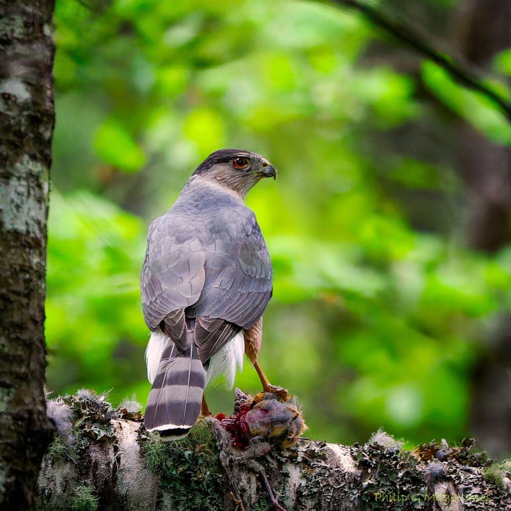 I heard the Cooper’s Hawks in April.  My friends reported that they saw them mating in the area between the two retention ponds on Morgan Drive.  On 30 April at dusk I decided to visit the area at dusk. For the first time, I saw the male plucking feathers off prey on the Plucking Post. Note the bulging stomach (crop) that shows on the hawk.